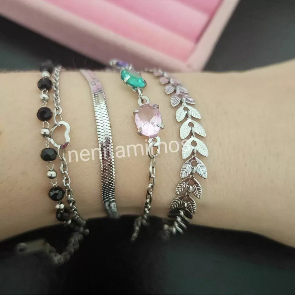 Pulseira folhinhas trabalhadas em aço inoxidável prateado setas escama de peixe setinhas