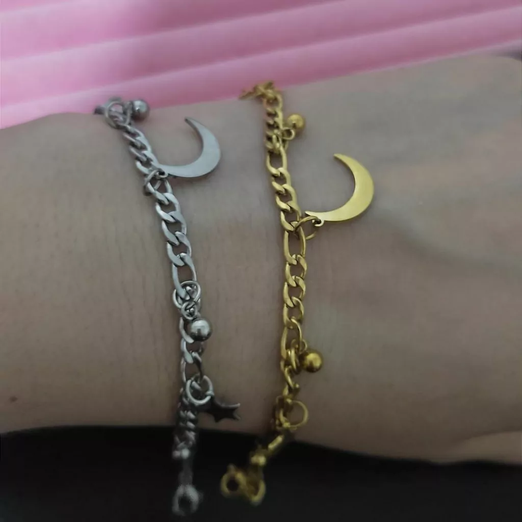 Pulseira lua estrelas e bolinhas em aço inoxidável prata ou com banho dourado corrente grossa