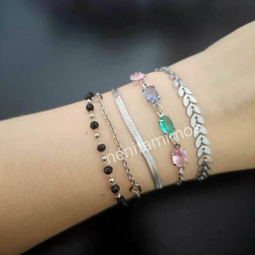Pulseira pedras de zircônia e aço inoxidável prateado com corrente fina
